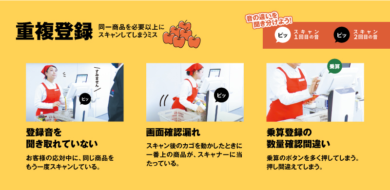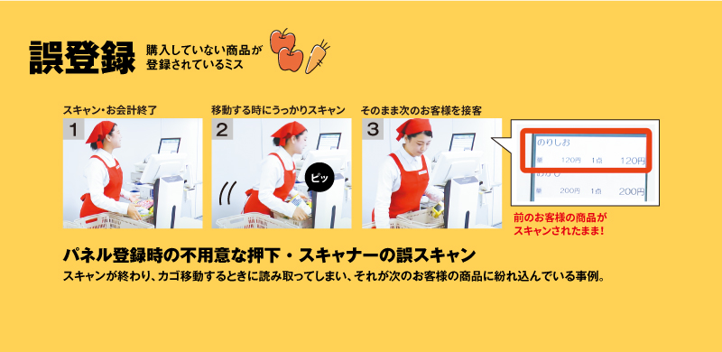 スキャンの際に発生するミスはいくつかありますが、今回は同じ商品が過剰に登録されてしまう「重複登録」、購入していない商品が登録されてしまう「誤登録」にフォーカスしてご紹介いたします。