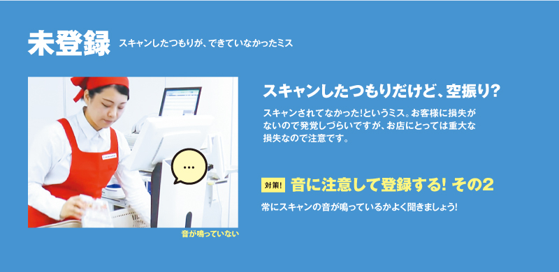 お客様に損がないのでクレームなどはありませんが、商品の価格がそのまま損失となり、お店の売上や利益に大きな影響を与えます。防ぐためには、商品のスキャンと音は必ずセットであるものとの認識を強くしましょう!
