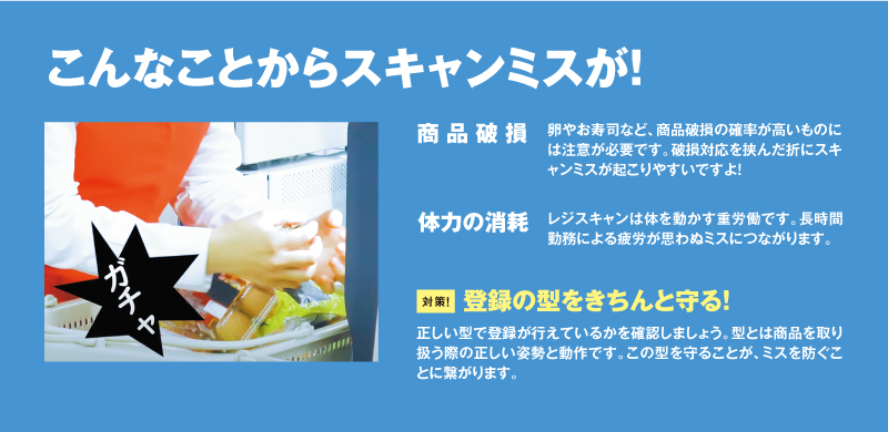 これらを防ぐには、登録の型(姿勢や動作)をきちんと守ることが重要です。まずは正しい型で登録が行えているかを確認しましょう。型とは商品を取り扱う際の正しい姿勢と動作です。この型を守ることがミスを防ぐことになります。